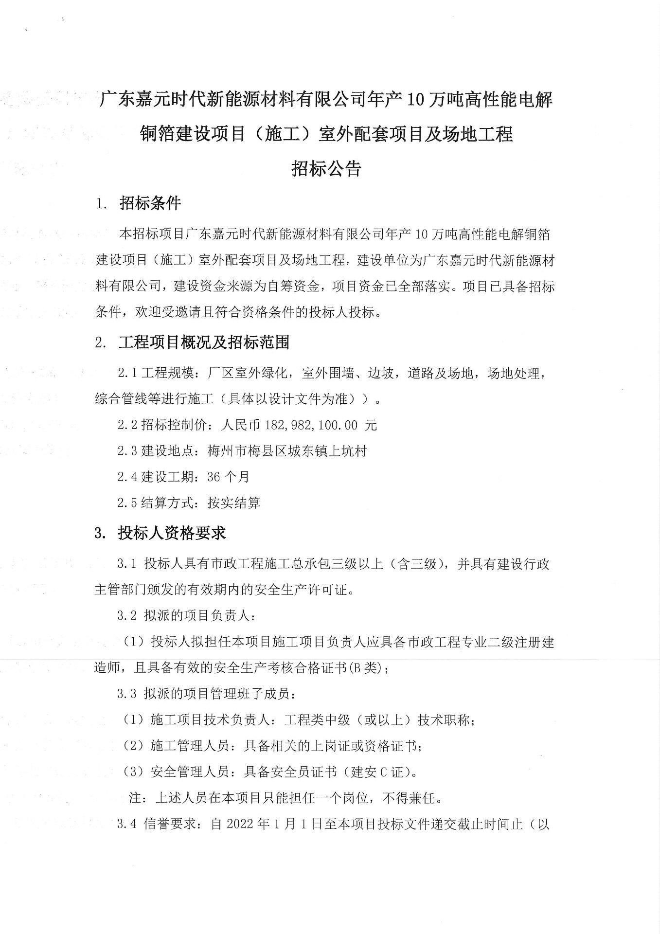廣東嘉元時代新能源材料有限公司年產10萬噸高性能電解銅箔建設項目(施工)室外配套項目及場地工程招標公告